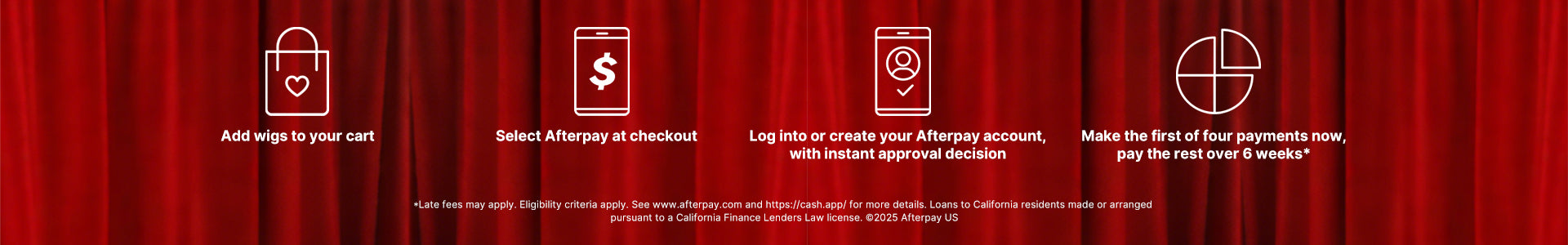 Simply shop online and add items to your shopping bag and checkout as normal. At the checkout, choose Afterpay as your payment method. First-time customers will need to register with Afterpay and provide payment details and returning customers log in to make their purchase. A minimum purchase amount may apply and you must meet additional eligibility requirements to qualify.