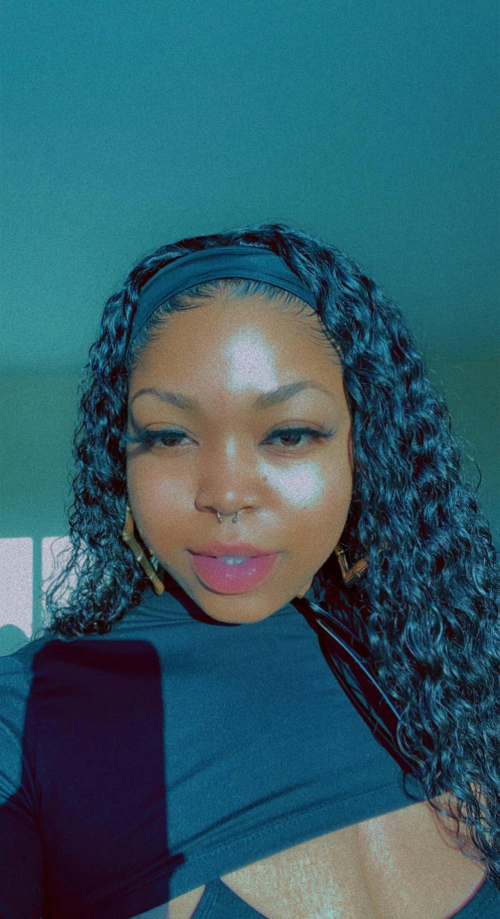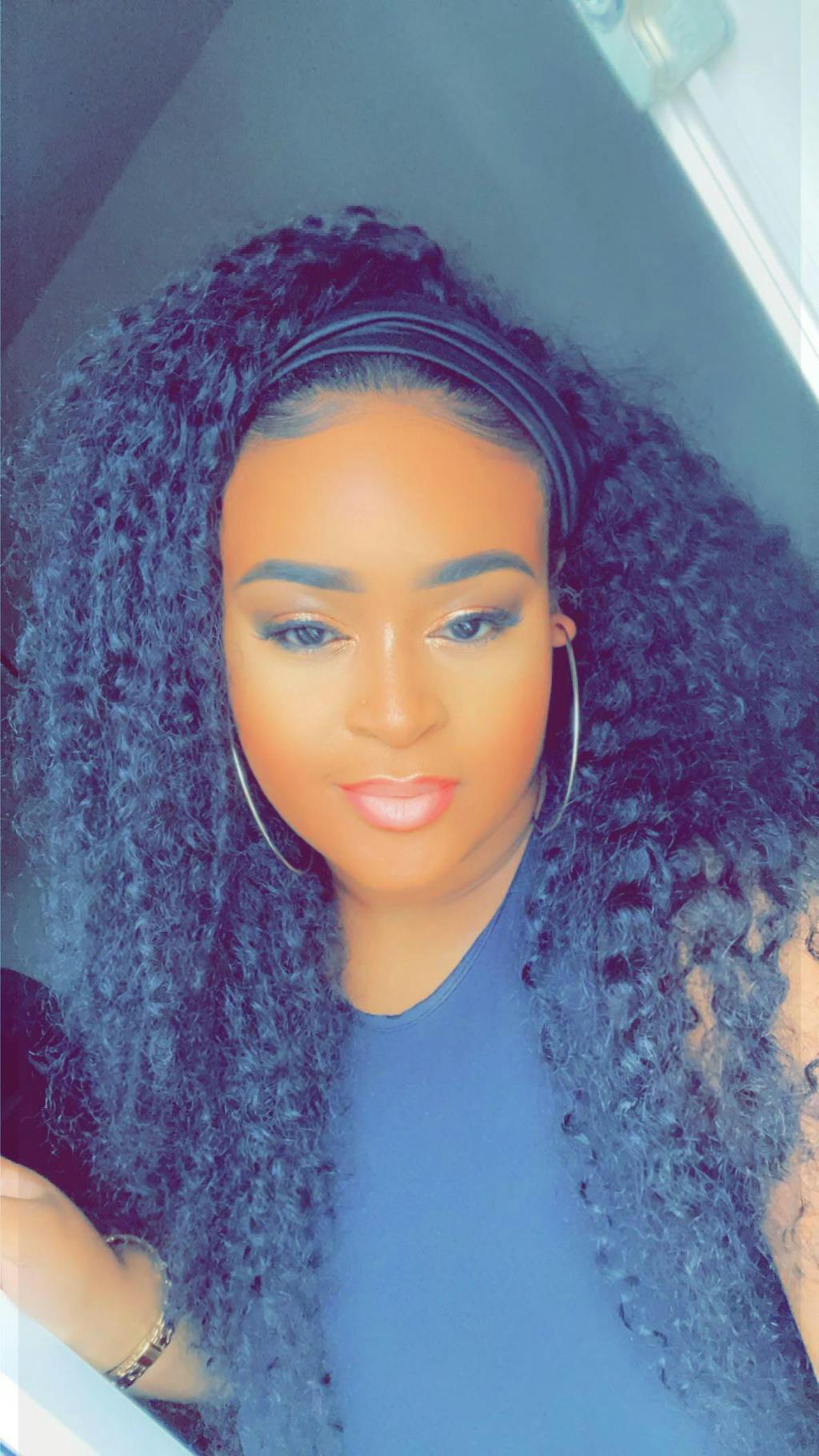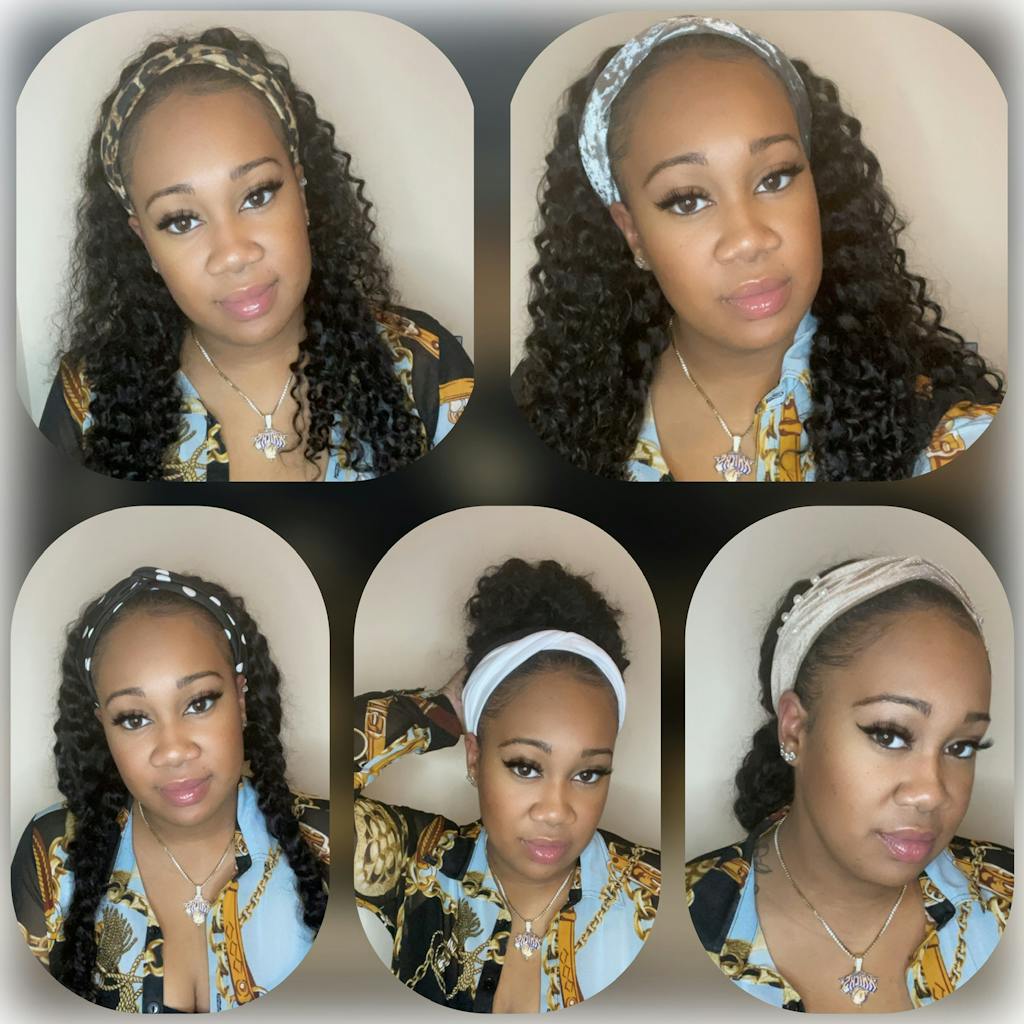 a black women wearing deep wave headband wig Deep wave headband wig can install in 5 seconds deep wave headband wig is soft and comfortable Change the headband to create different styles everyone enjoy headband wig-reviews of deep wave headband wig Luvme human hair deep wave headband wig-5's install wig club