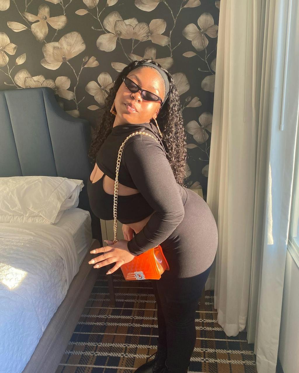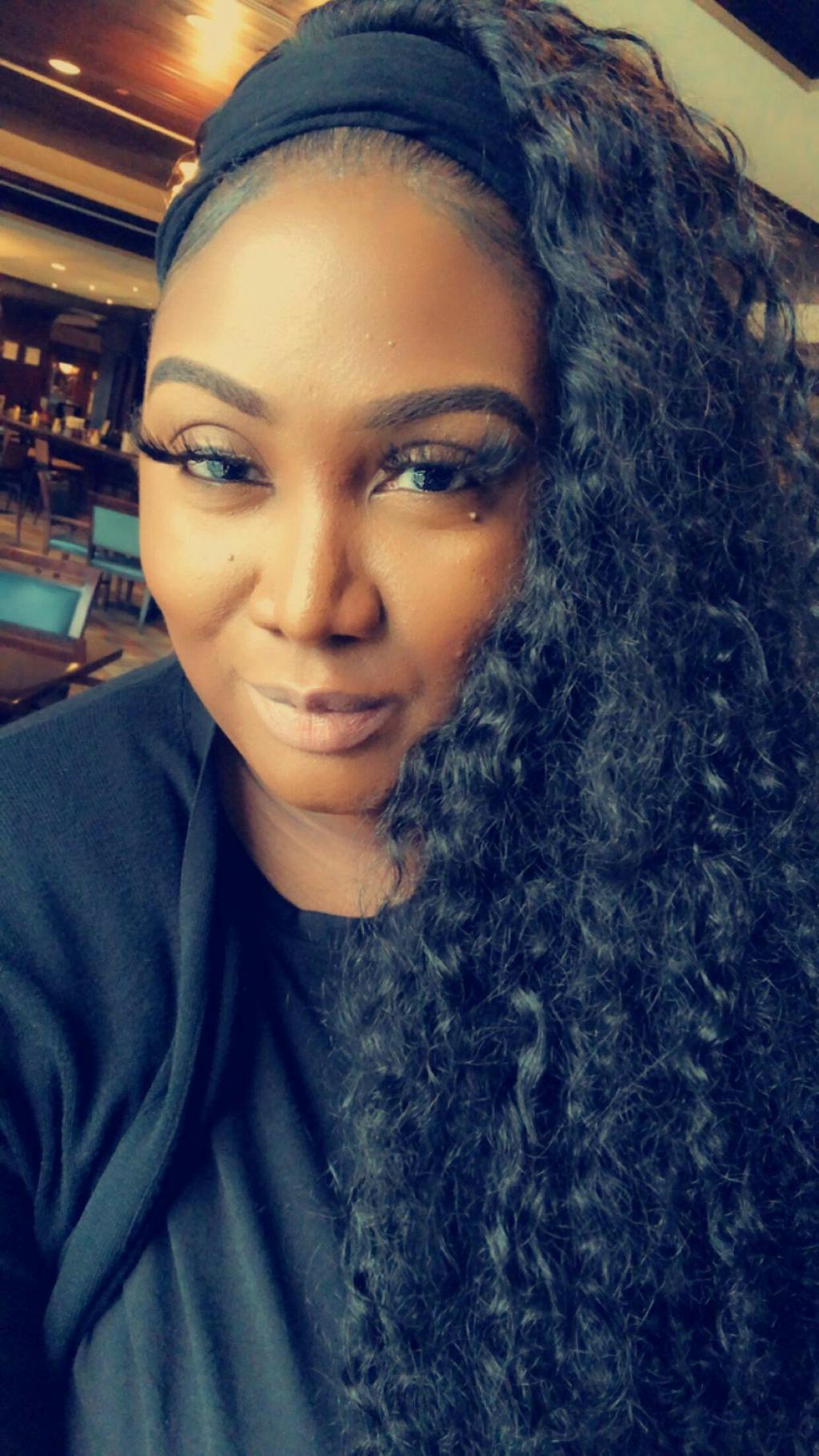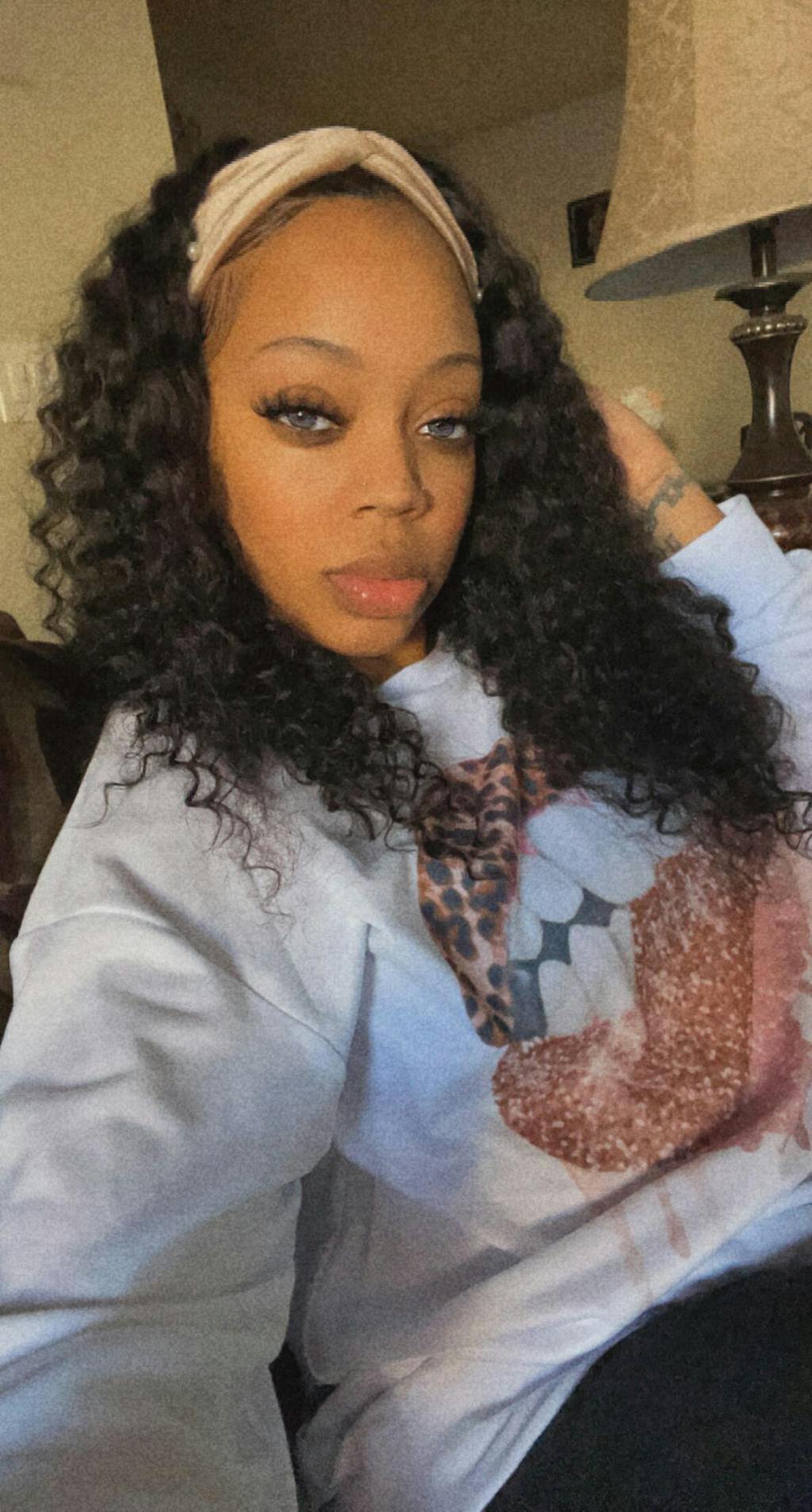 a black women wearing deep wave headband wig Deep wave headband wig can install in 5 seconds deep wave headband wig is soft and comfortable Change the headband to create different styles everyone enjoy headband wig-reviews of deep wave headband wig Luvme human hair deep wave headband wig-5's install wig club